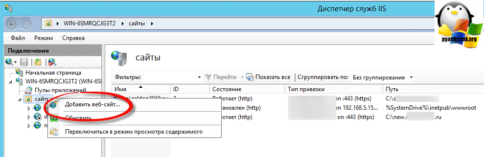 Я хочу создать отдельный сайт, пускай это будет iis.pyatilistnik.org, для этого переходим в пункт сайты и через правый клик ,выбираем пункт «Добавить веб-сайт»