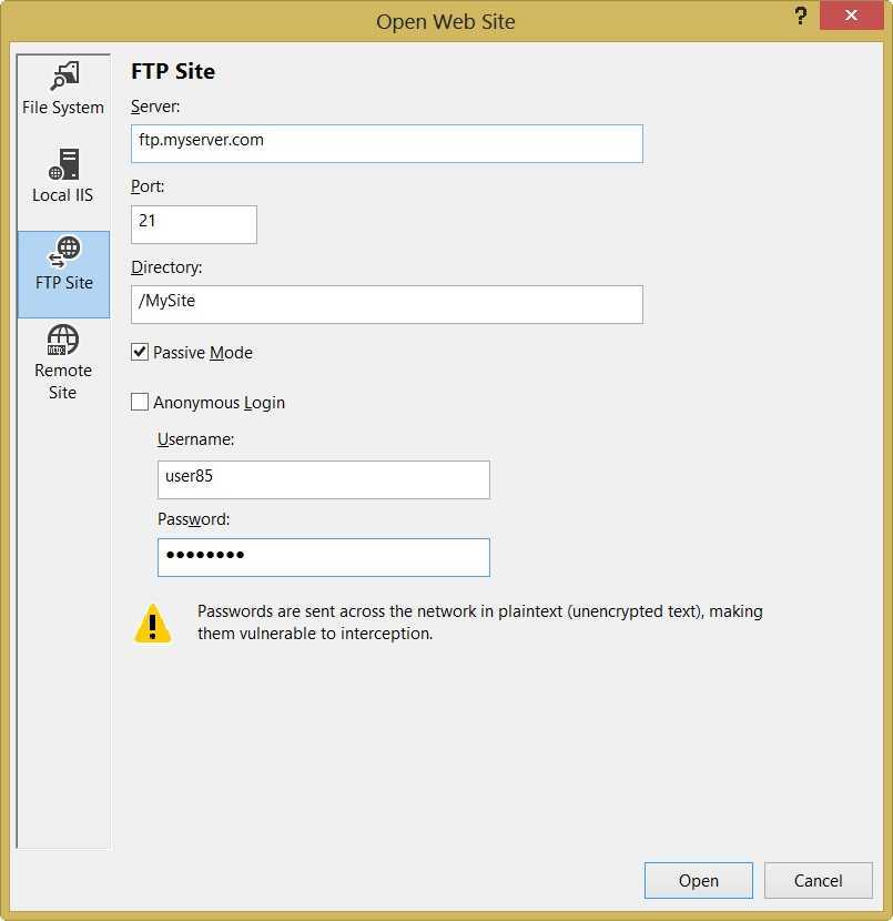 Как только вы выберите соответствующий пункт назначения, нажмите кнопку Open. Visual Studio попытается подключиться к удаленному сайт и получить список файлов.