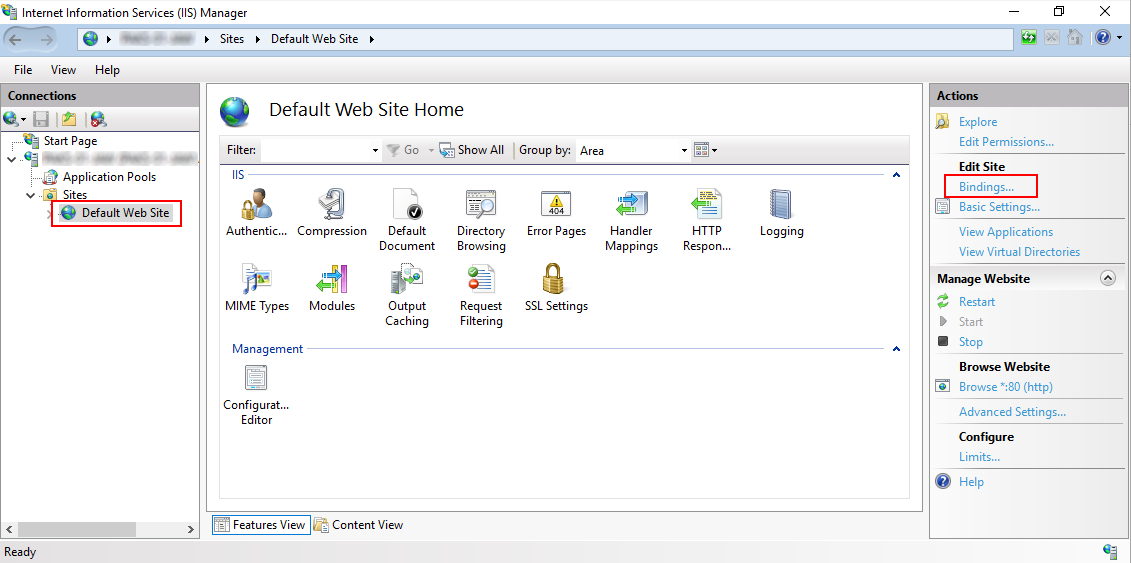 Как видите, в моем случае я поменял порт используемый по умолчанию (с 80 на 8080). Я сделал это, т.к. на 80-м у меня запущен локальный Apache-сервер. Если у вас возникает такая же проблема, то изменить порт можно щелкнув правой кнопкой мыши по сайту (Default Web Site) и выбрав в контекстном меню «Изменить привязки» (Bindings). После этого в диалоговом окне можно изменить порт, используемый по умолчанию.