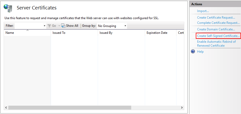 Откроется окно доступных сертификатов сервера (Server Certificates) в котором нужно нажать «Создать самозаверенный сертификат…» («Create Self-Signed Certificate…»).