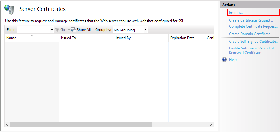 Предполагается, что сертификат получен и добавлен в список сертификатов сервера. Если сертификат получен с помощью распространенного сертифицирующего центра, то его нужно предварительно импортировать в окне «Сертификаты сервера» («Server Certificates»).