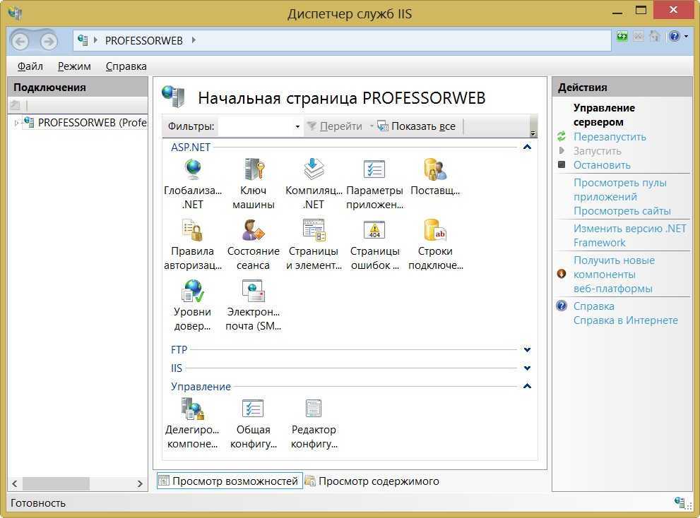 Теперь нужно ознакомиться с рядом терминов, используемых в IIS. В левой части окна IIS Manager отображается запись с именем используемого сервера. Наш сервер имеет имя PROFESSORWEB, сгенерированное по умолчанию Windows 8, которое будет использоваться в большинстве примеров. В центральной области отображается представление сервера. Это представление отображает набор значков, которые позволяют конфигурировать параметры сервера. В правой части экрана расположен список доступных действий. Например, в этом представлении можно запускать, останавливать и перезапускать сервер.