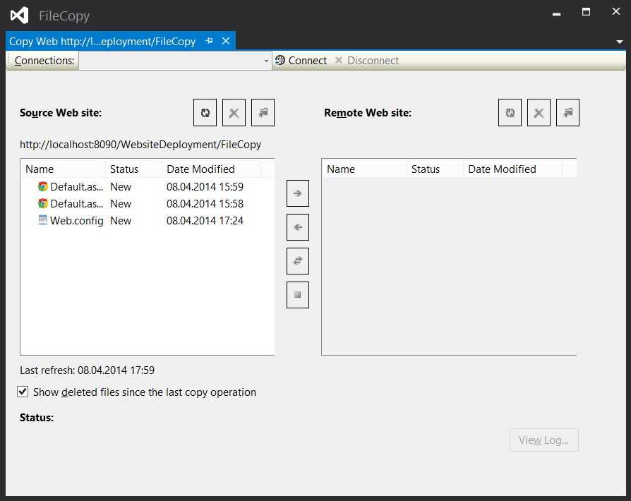 Visual Studio также включает в себя быстрый и простой способ для передачи файлов веб-приложения. Вам просто нужно выбрать в меню WebSite —> Copy Web Site. Откроется новое диалоговое окно Visual Studio, которое покажется знакомым любому, кто имел дело с различными IDE-программами для работы с сайтами, такими как Dreamweaver или Expression Web: