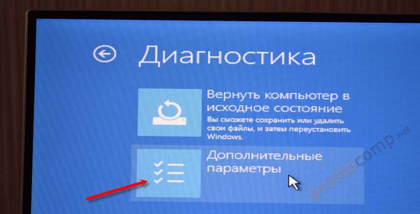 После запуска переходим в раздел диагностика, а затем в дополнительные параметры. Как на скринах ниже.