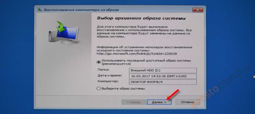 Накопитель, на котором хранится резервная копия Windows 10 должен быть подключен к компьютеру. Система сама найдет и предложит вам последний доступный образ системы. Если есть необходимость, можно выбрать образ вручную.