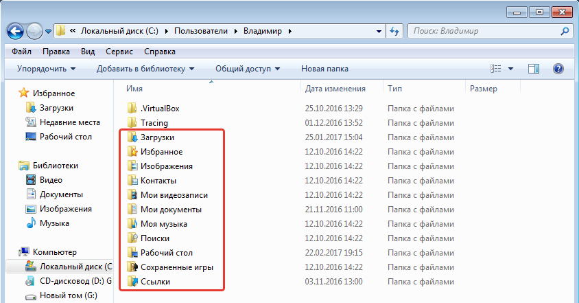 Здесь отображаются все папки пользователя, такие как «Рабочий стол», «Документы», «Загрузки» и др. Здесь могут также быть и другие папки, например, как на изображении выше, которые не обведены красным. Такие папки могут быть созданы какими-либо программами, т. е. это нормально.