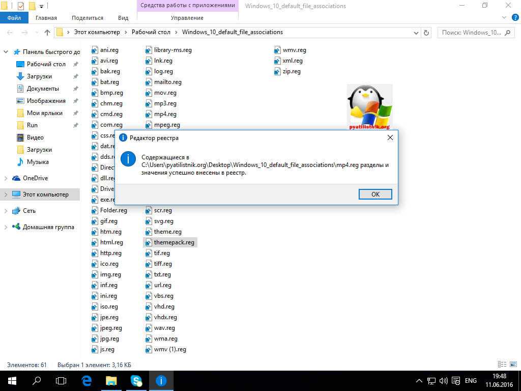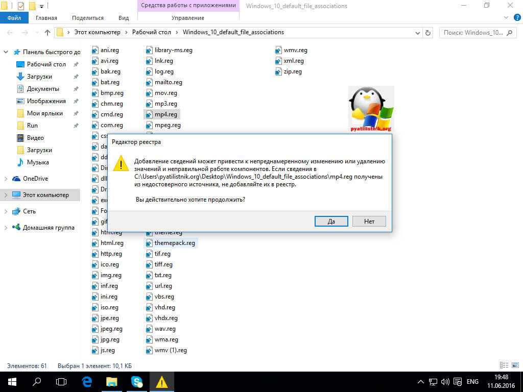 Нужно «Запустить» закачанное и, после успешного внесения данных в реестр, перезагрузить свой компьютер — всё уже будет работать. Для Виндовс 7 имеется свой отдельный файл.reg для сброса ассоциаций.