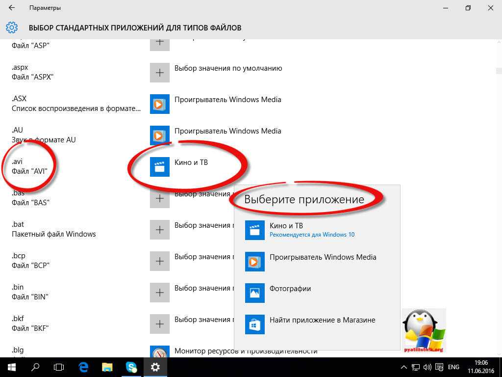 Давайте разбираться, что за, что отвечает. Первое, что мы нажмем это Выбор стандартных приложений для типов файлов. У вас открывается полный список всех форматов, для примера я выбрал формат .avi это видео файлы, по умолчанию он открывается приложением Кино и Тв, щелкаю по нему и у вас открылся более расширенный список доступных приложений, если чего то нет, то нажимаем Найти приложение в Магазине, это ручное соотнесение ассоциации файлов в Windows 10.