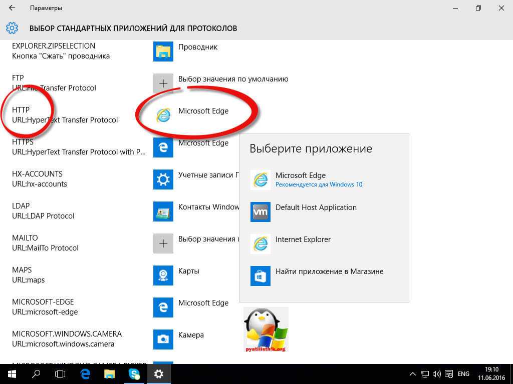 Теперь выберем пункт Выбор стандартных приложений для протоколов. Напомню протоколы это по простому правила и стандарты по которым работают все программы. Допустим я хочу протокол http, который отвечает за просмотр веб страниц, открывать не Microsoft Edge, щелкаем по значку и перед нами все тот же знакомый список с выбором утилиты.