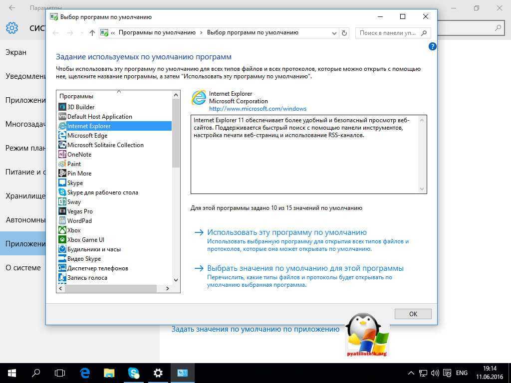 И последний пункт Задать значения по умолчанию по приложению. Откроет вам окно, где будет представлен весь список установленных в Windows 10 программ, и у вас будет возможно задать нужную, как программу по умолчанию. Простой пример браузером по умолчанию в Windows 10 идет Edge, а я например хочу, чтобы был Internet Explore, для этого я его выбираю и нажимаю использовать по умолчанию.