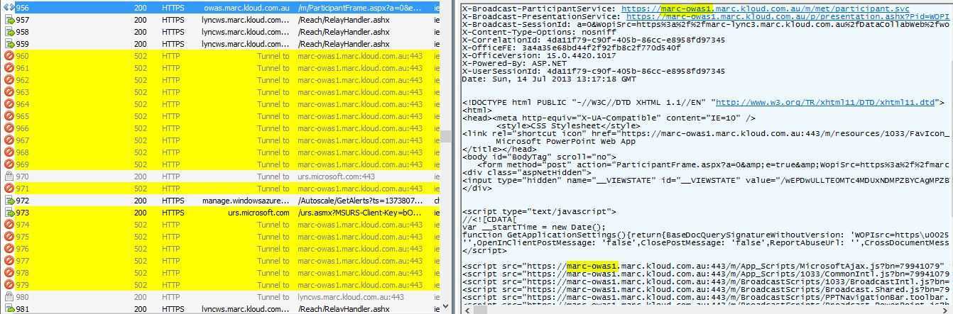 The client gets a referral to the Office Web Apps Server external URL https://owas.marc.kloud.com.au/m/ but the response body contains some X-Headers and javascript URLs for the backend URL of https://marc-owas1.marc.kloud.com.au/m/ URLs as you can see on the right hand side in the diagram below (click for a larger version). The client then tries to open a connection to the internal hostname which does not exist in DNS.