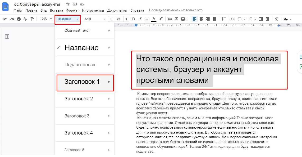 Сделать заголовки в гугл документе очень просто. Для этого выделите название раздела и нажмите в панели инструментов на стрелку возле кнопки “название”. Здесь достаточно выбрать нужный размер заголовка или подзаголовка.