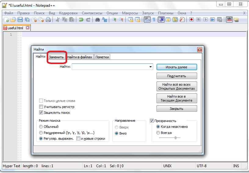 - Перед нами открывается стандартное окно поиска в программе Notepad++. Доступ к нему также можно получить, нажав сочетания клавиш Ctrl+F. Обязательно активируем кнопку «Регулярные выражения», чтобы работать с данной функцией.