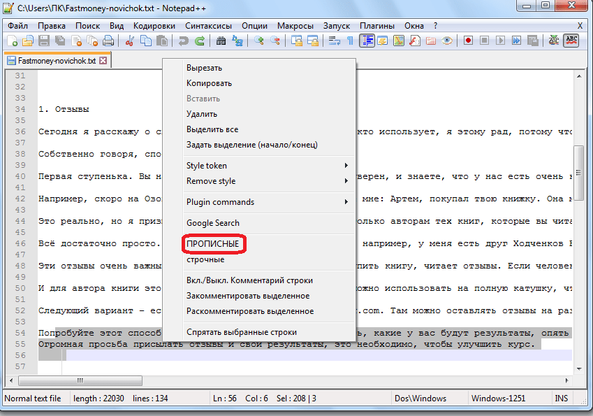 При редактировании текста, кроме обычных изменений, внесенных с помощью клавиатуры, доступно внесение правок с помощью инструментов программы. Это значительно упрощает процесс редактирования, и делает его быстрее. Например, при помощи контекстного меню, имеется возможность конвертация всех букв выделенной области из строчных в прописные, и обратно.