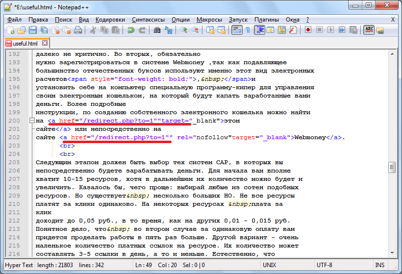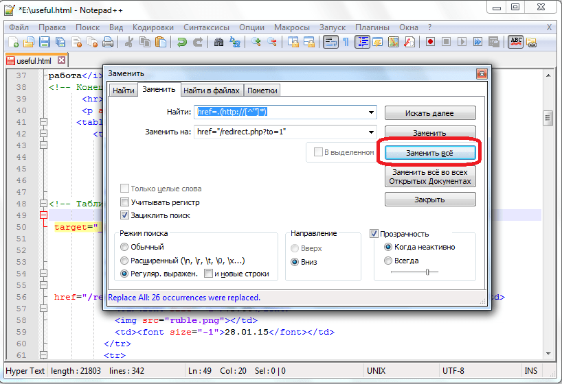 Сделаем перенаправление внешних ссылок через редирект. Для этого в графе «Найти» проставляем значение «href=.(http://*)», а в поле «Заменить» — «href=»/redirect.php?to=1″». Жмем на кнопку «Заменить всё».