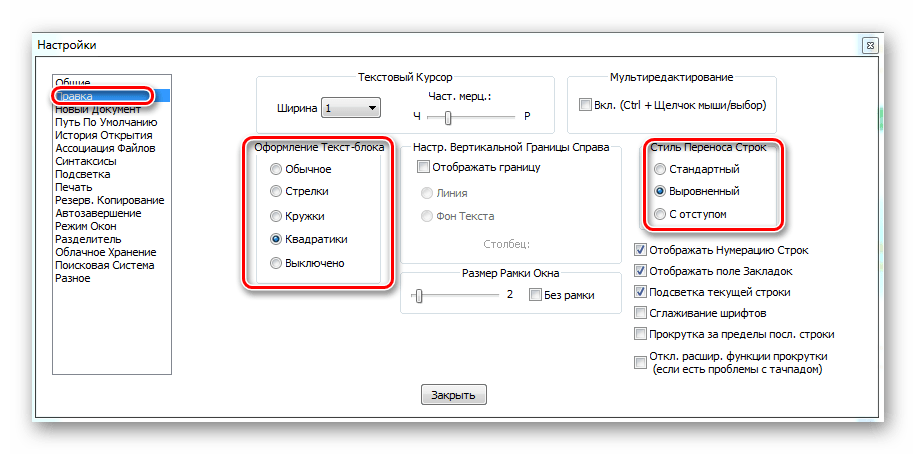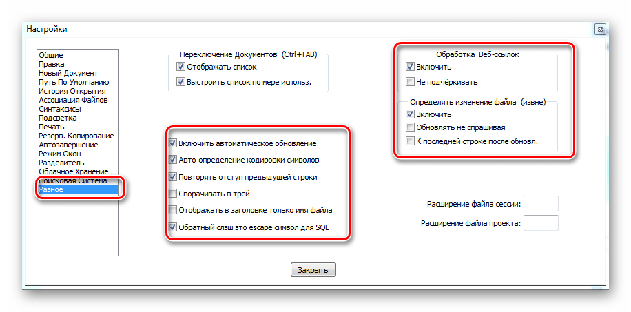 Здесь вы можете управлять такими функциями как подсветка парных тегов, вид переключенных документов, обработка веб-ссылок и т.д. Здесь также можно отключить автоматические обновления Нотпада, а также настроить расширение файла и то, как он будет сворачиваться.