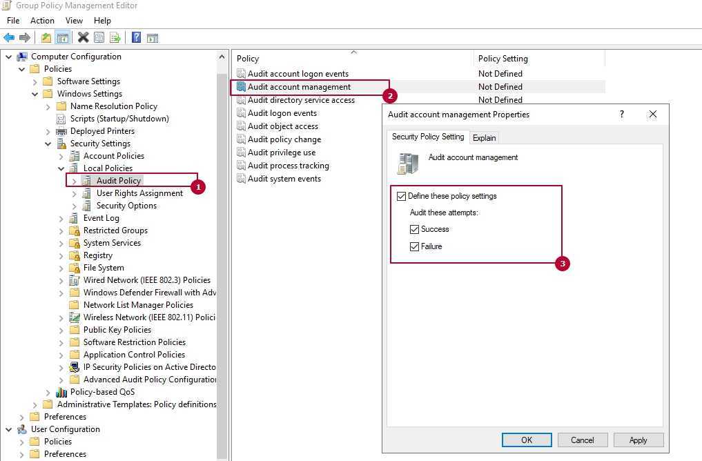- ‘Computer Configuration’ — ‘Policies’ — ‘Windows Settings’ — ‘Security Settings’ — ‘Local Policies’ = ‘Audit Policy’;