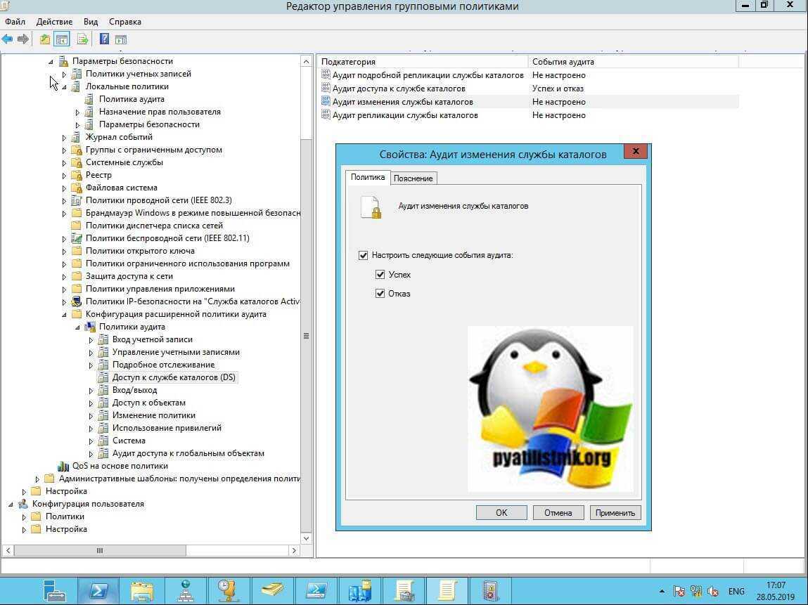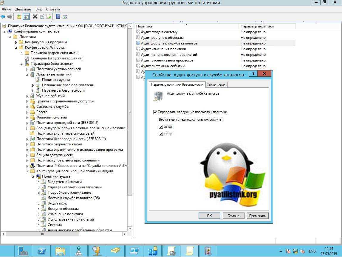 Так же активируйте «Аудит изменения службы каталогов (Audit Directory Service Access)».