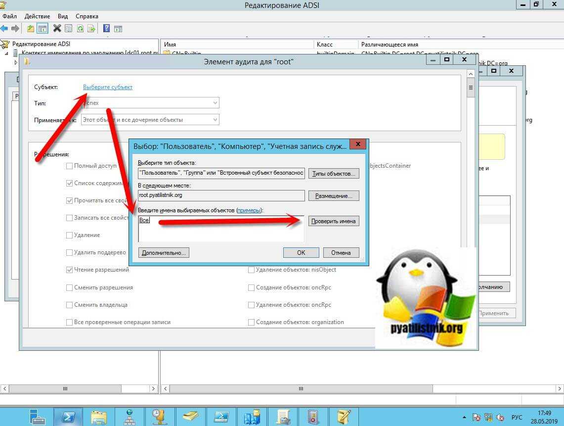 Нажмите кнопку «Добавить». В окне элемента аудита, нажмите кнопку «Выберите субъект». Введите «Все» в текстовом поле, чтобы проверить изменения, внесенные всеми объектами Active Directory в организационных единицах. Вы можете ввести имя пользователя или группы, чтобы проверять только изменения, сделанные ими. Нажмите «Проверить имена», чтобы подтвердить запись, и нажмите «ОК», чтобы добавить ее.