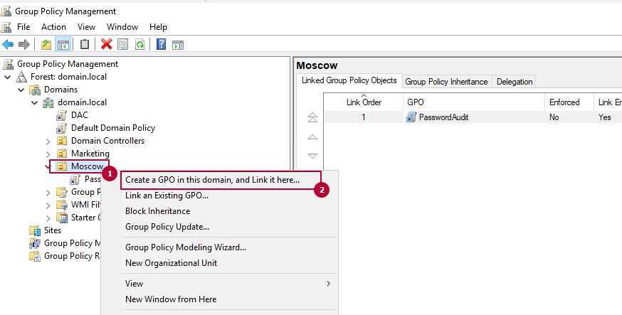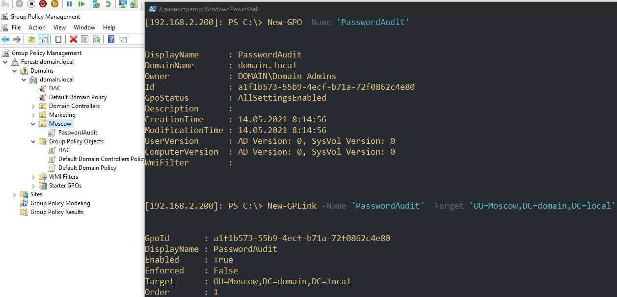 В примерах я использую OU Moscow. Через Powershell создать и привязать политику тоже можно. Это делается следующим образом:
