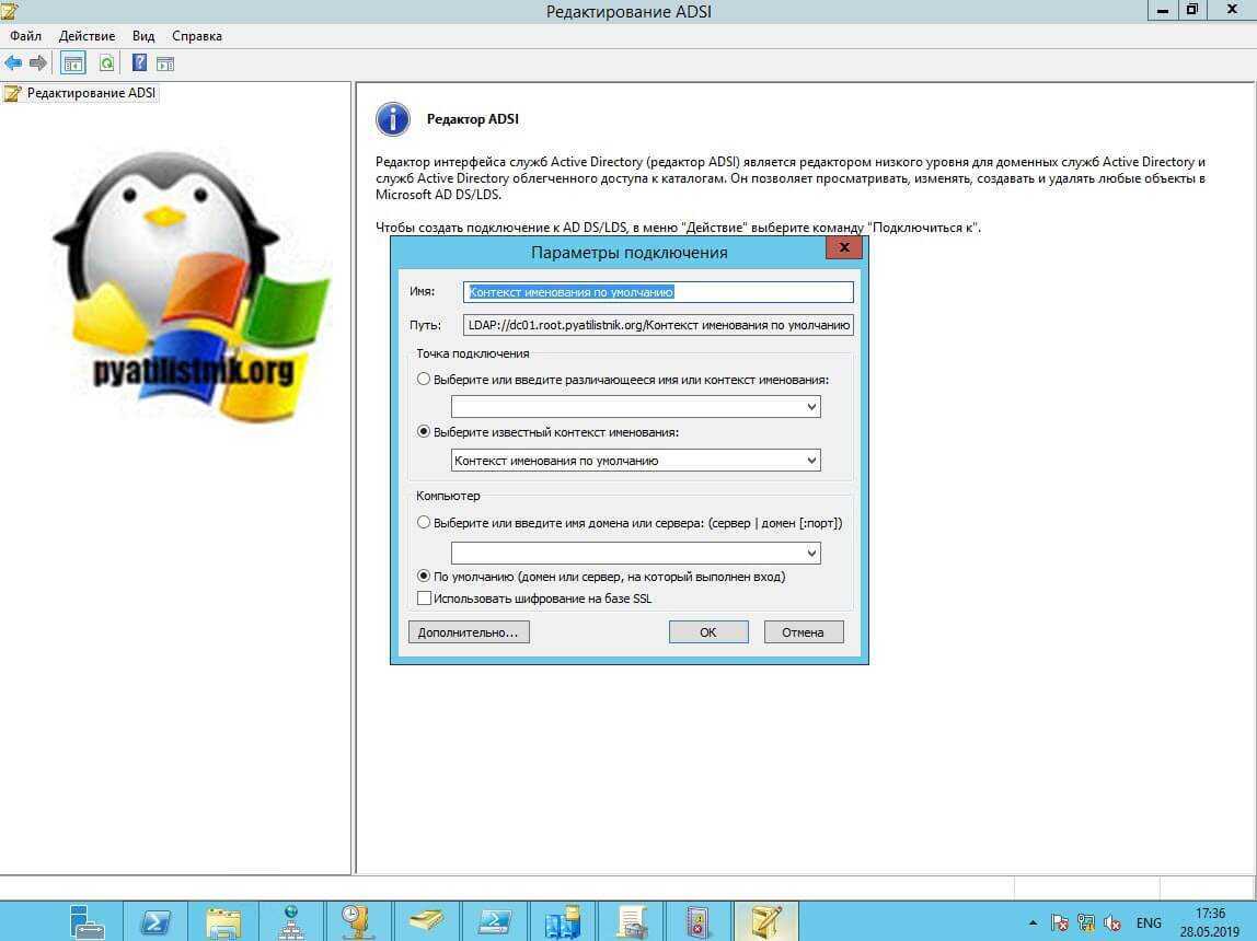 После включения аудита Active Directory, давайте выберем, что мы хотим проверять. Откройте окно «Редактирование ADSI» Выбираете контекст именования по умолчанию.