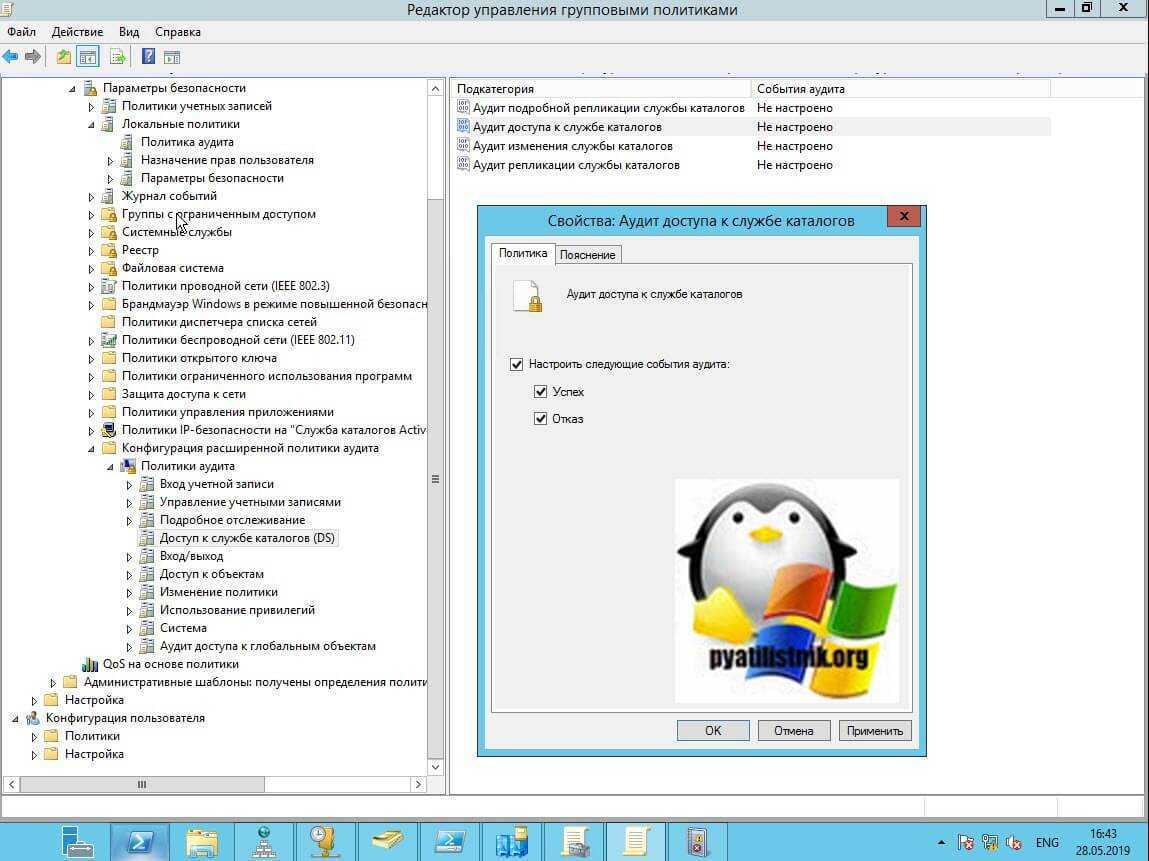 Находим в данном разделе пункт «Аудит доступа к службе каталогов» и активируем пункты «Успех» и «отказ».