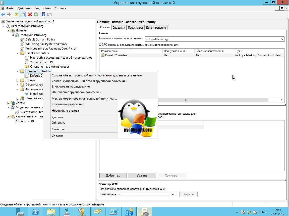 Самый удобный способ создать политику — использовать оснастку ‘Group Policy Management’. Эта оснастка может быть открыта через RSAT или на домен-контроллер. Оснастку групповых политик так же открывается командой: