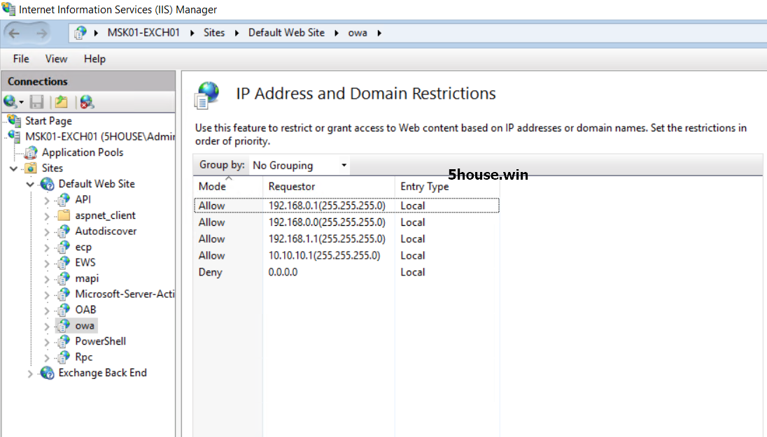 Во избежание ошибок OWA , рекомендуется использовать iis-Access for unspecified clients-Deny за место 0.0.0.0
