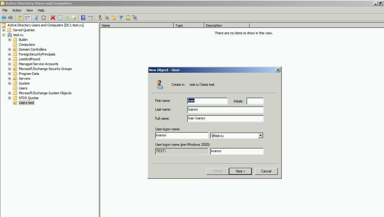 Логин — полный логин в формате, аналогичном ad1, он показан в личном кабинете на странице с ящиками Exchange. Здесь ad1 — имя домена, логин — имя пользователя, если есть отдельное окно для домена, то ad1 необходимо записать туда, а имя пользователя писать без ad1.