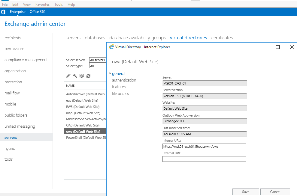 Откройте центр администрирования Exchange, перейдя к URL-адресу вашего сервера клиентского доступа. Например, .