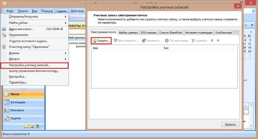 - В диалоговом окне нажмите кнопку «Создать» на вкладке «Почта».