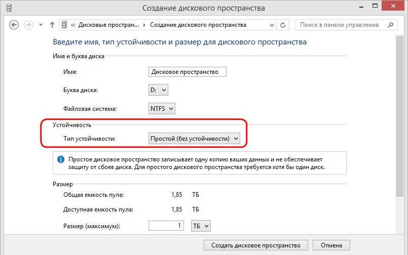• Выбор типа устойчивости, по сути, конфигурации RAID; • Выбор файловой системы, если кроме NTFS предлагается ReFS; • Задание размера.