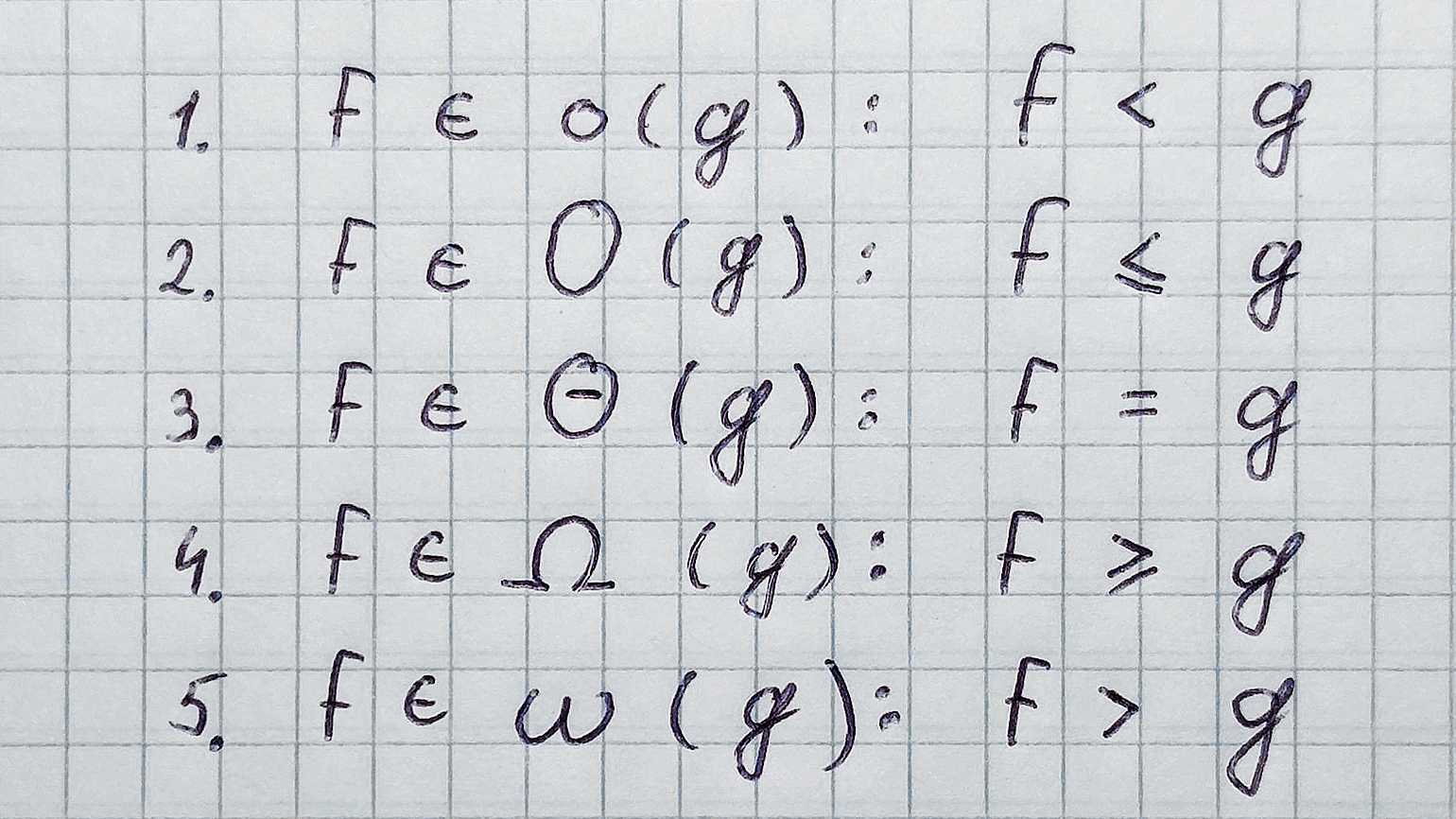 На протяжении всей статьи мы говорили про Big O Notation. А теперь сюрприз: это только одна из пяти существующих нотаций. Вот они слева направо: Намджун, Чонгук, Чингачгук… простите, не удержался. Сверху вниз: Small o, Big O, Big Theta, Big Omega, Small omega. f — это реальная функция сложности нашего алгоритма, а g — асимптотическая.