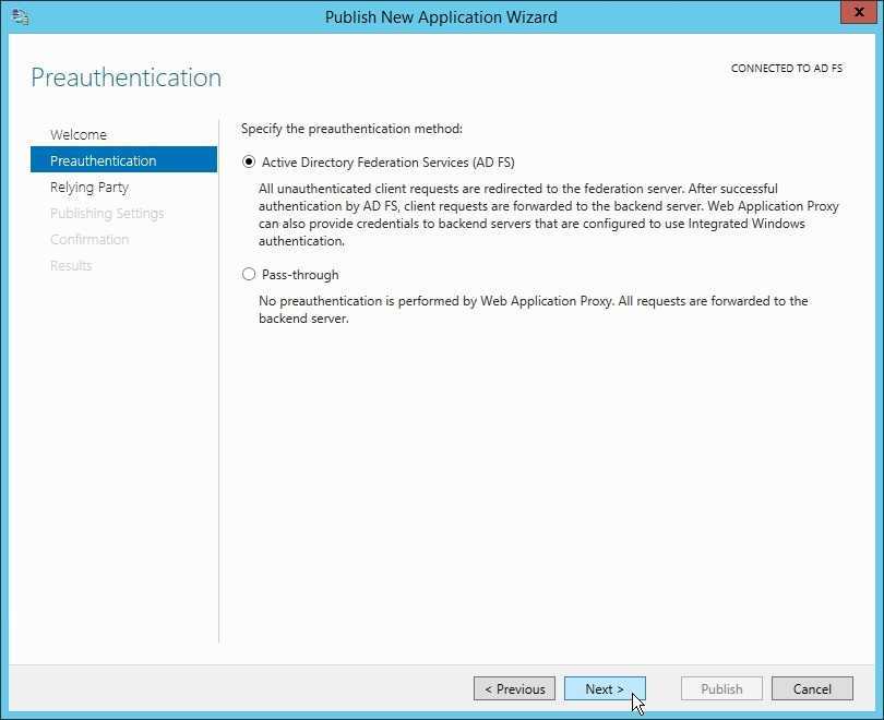 Теперь ничто не мешает опубликовать сервис. Нажимаем Publish и следуем указаниям визарда. Первый шаг — выбор метода преаутентификации, здеcь два варианта, о которых мы говорили в самом начале: AD FS и Pass-through. Первый вариант содержит на один шаг больше. Выбираем Pass-through.