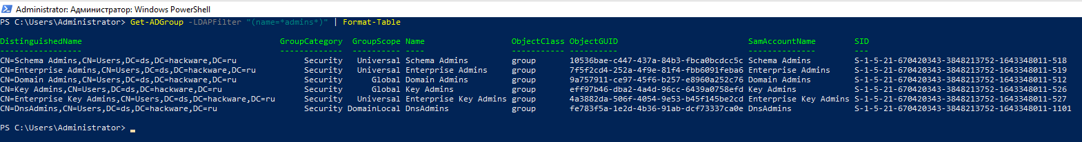 Эта команда отображает информацию об основных атрибутах группы (DN, тип группы, имя, SID). Чтобы отобразить значения всех атрибутов группы домена AD, выполните следующую команду: