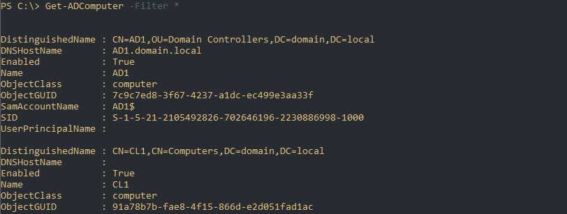 - Командлеты Get- класса используются для получения различной информации из Active Directory (Get-ADUser — свойства пользователя, Get-ADComputer — настройки компьютера, Get-ADGroupMember — членство в группе и так далее). Чтобы запустить их, вам не нужно быть администратором домена. Любой пользователь домена может запускать команды PowerShell для получения значений атрибутов объекта AD (кроме конфиденциальных, как в примере с LAPS);