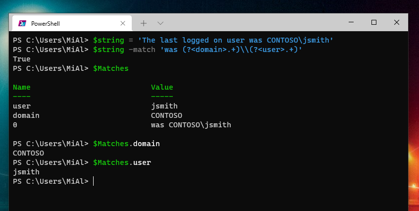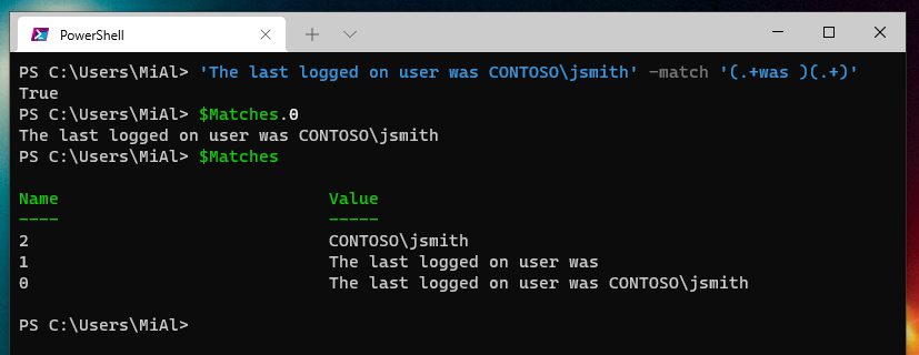 $Matches.0 The last logged on user was CONTOSO\jsmith