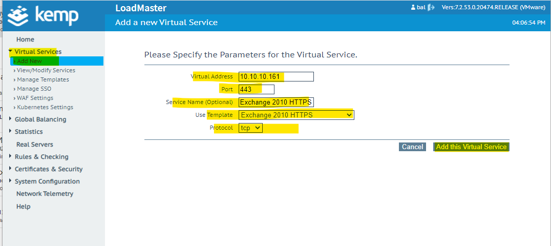 2. Перейти в раздел создания нового виртуального сервиса и указать IP-адрес (10.10.10.161 – для имени mail.itproblog.ru), порт и соответствующий шаблон: