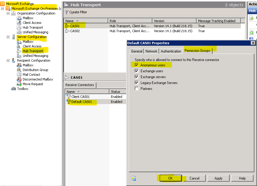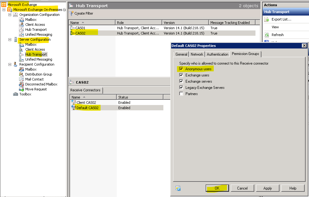 Теперь нам необходимо немного скорректировать коннекторы приема электронной почты – задать имя, которым сервер будет представляться и разрешить прием писем на 25 TCP порту от анонимных пользователей.