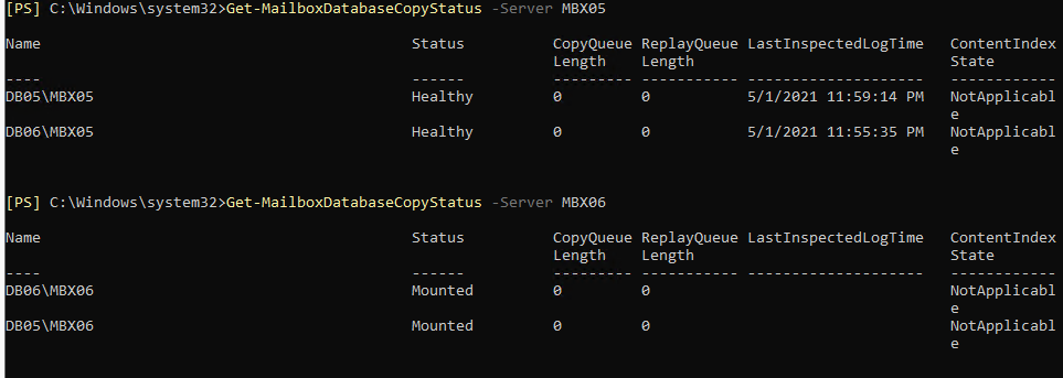 Нулевые значения в колонках “Copy Queue Length” и “Replay Queue Length” говорят о том, что почтовая база успешно реплицируется между серверами MBX05 и MBX06.