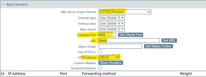 Пара комментариев. Параметры Checked Port и URL определяют как балансировщик понимает – жив ли сервис или нет на реальном сервере, т.е. балансировщик проверяет адрес вида https://10.10.10.155/owa и если получает отчет вида 200 OK, то делает заключение, что реальный сервер жив и продолжает балансировать траффик на него. Если же он получает ответ с ошибкой, то балансировщик исключает этот реальный сервер из пула для балансировки.