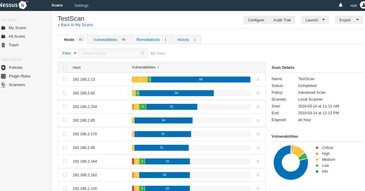 Это сканер для обнаружения известных уязвимостей и автоматизации проверки в системе. Исходный код закрыт, однако существует бесплатная версия под названием Nessus Home — даёт возможность сканировать до 16 IP-адресов, при этом качество сканирования не уступает платной версии.