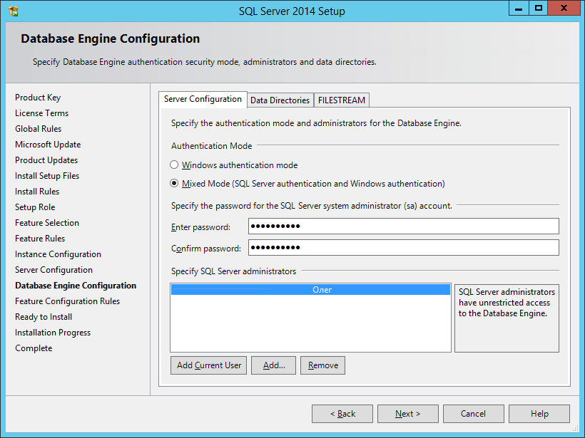 Getting into Database Engine Configuration. Configure Authentication Mode – change it to Mixed Mode, set a password on user sa. Here, with the Add Current User button, we do our accounting by the database admin.