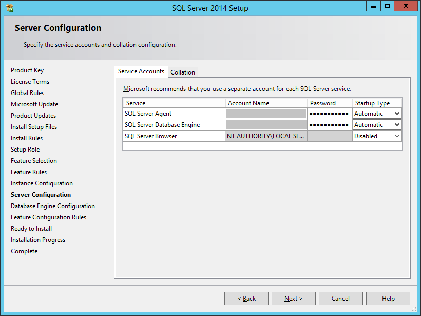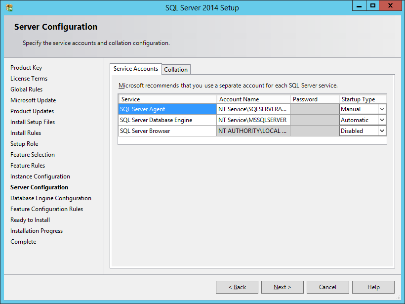 Getting into Server Configuration. Here we change the user under which SQL Server and SQL Server Agent will run.
