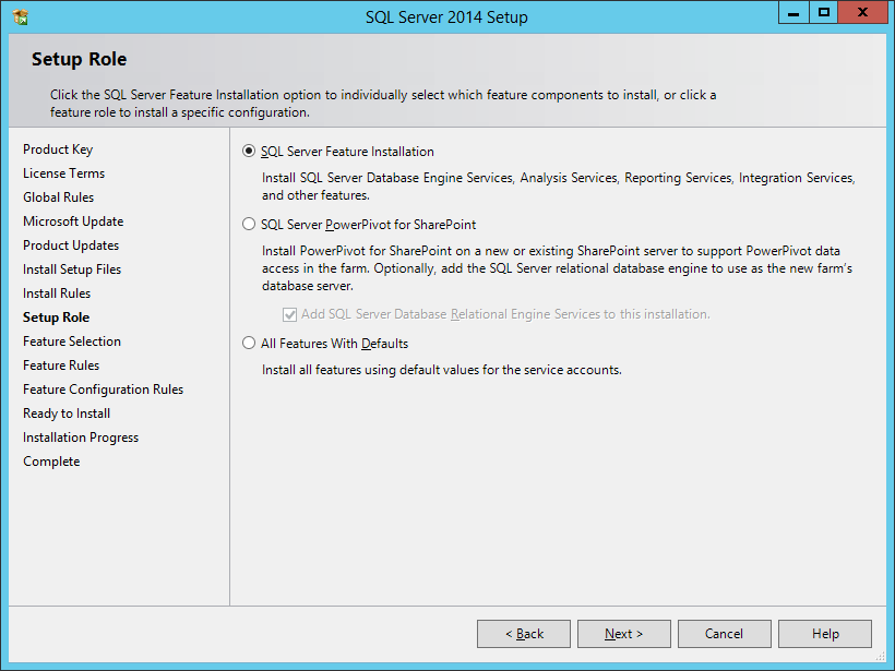 We’re hitting Setup Role. I choose SQL Server Feature Installation. Next.