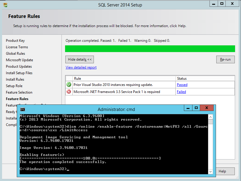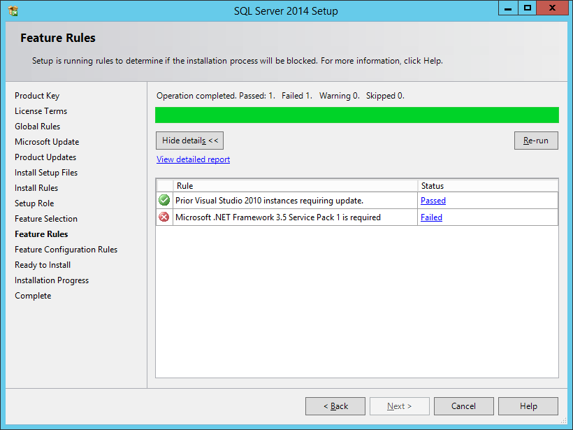 We’re hitting Feature Rules. Error – .NET Framework 3.5 SP1 is missing. Man, we couldn’t have said it before. Do not close the installer, put the .NET Framework 3.5 in parallel: