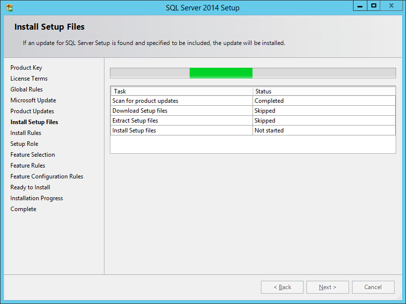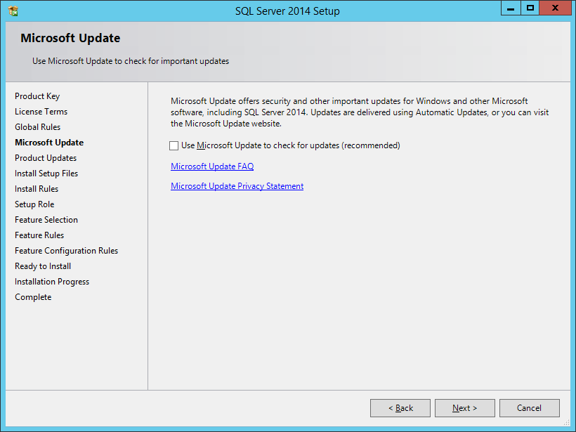 Попадаю в Microsoft Update. Нам предлагают проверить обновления винды и SQL сервера. В некоторых случаях это неудобно, я не проверяю, тем более что у меня и так потом будут ставиться сервис паки. Next. Products Updates автоматически пропускается.