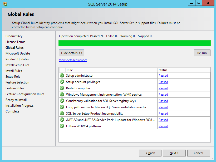 I’m hitting Global Rules. It’s a pre-installation test. Failed: 0 – it’s okay. Next.