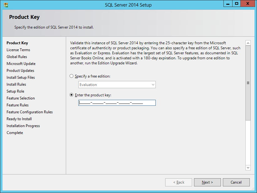 На странице «Ключ продукта» щелкните переключатель, чтобы определить, обновлять до бесплатного выпуска SQL Serverили имеется ключ PID для рабочей версии продукта. Дополнительные сведения см. в статьях Выпуски и компоненты SQL Server и Поддерживаемые обновления версий и выпусков.