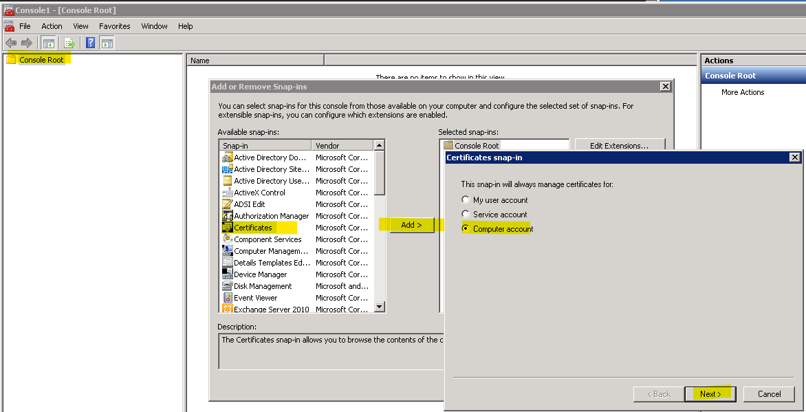 1. Запустить MMC консоль управления сертификатами для локального компьютера: